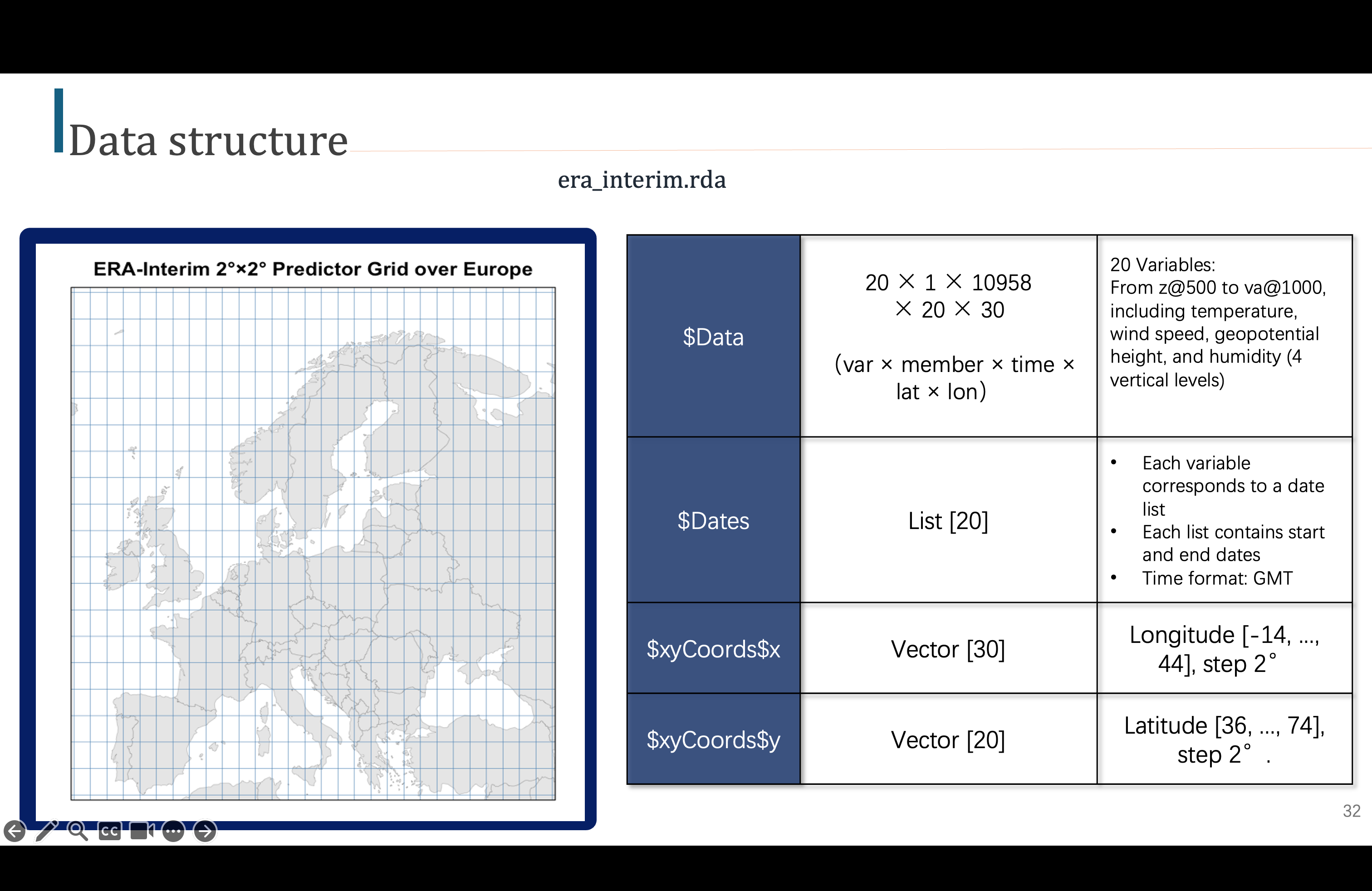 首先我们先看一下我们有的数据,这个是预测因子,也就是x,把欧洲区域划分成三维网格,经度、纬度,以及不同大气压层,在每个网格里,我们有20个predicteur,温度,风速,湿度,垂直高度,然后在四个垂直大气层上,也就是fois 4,然后我们一共有10958天的数据,因此会组成这么一个矩阵,维度很大,