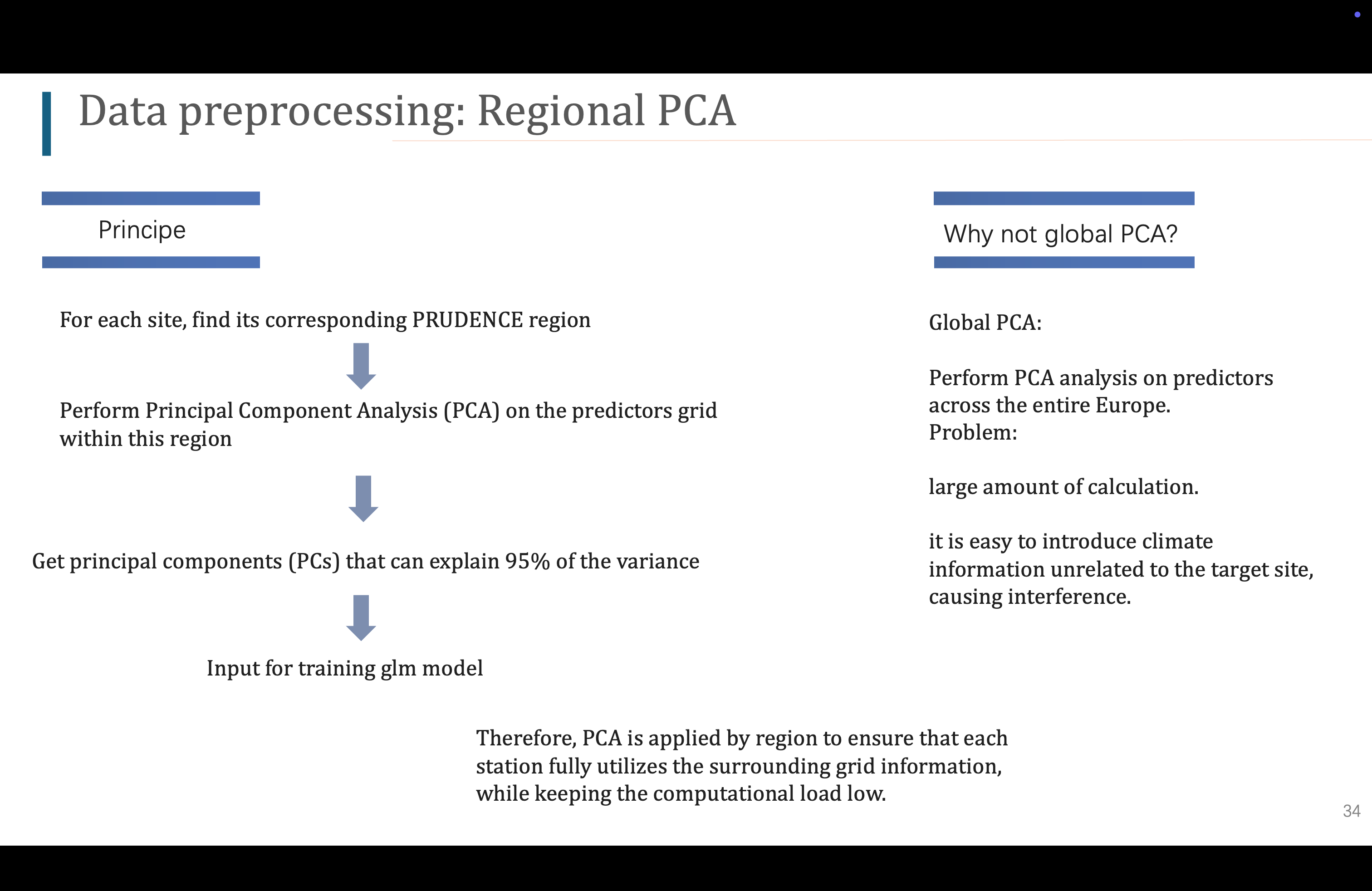 由于我们之前看到x prédicteur 的数据维度很大,所以必须进行降维操作,我们使用pca,提取能够解释95方差的那些主成分pcs,我们是根据prudence区域来进行PCA的。也就是说,我们要对每个站点都训练一个GLM 模型,那么什么作为GLM模型的输入呢,每个区域的主成分,这样的好处是,我们考虑了地理因素,比如说法国站点,我只用法国的prédicteur信息降维度后的主成分来进行训练,而不再使用德国的大气信息来训练,所以提取的主成分能更好解释该区域的大气变化。