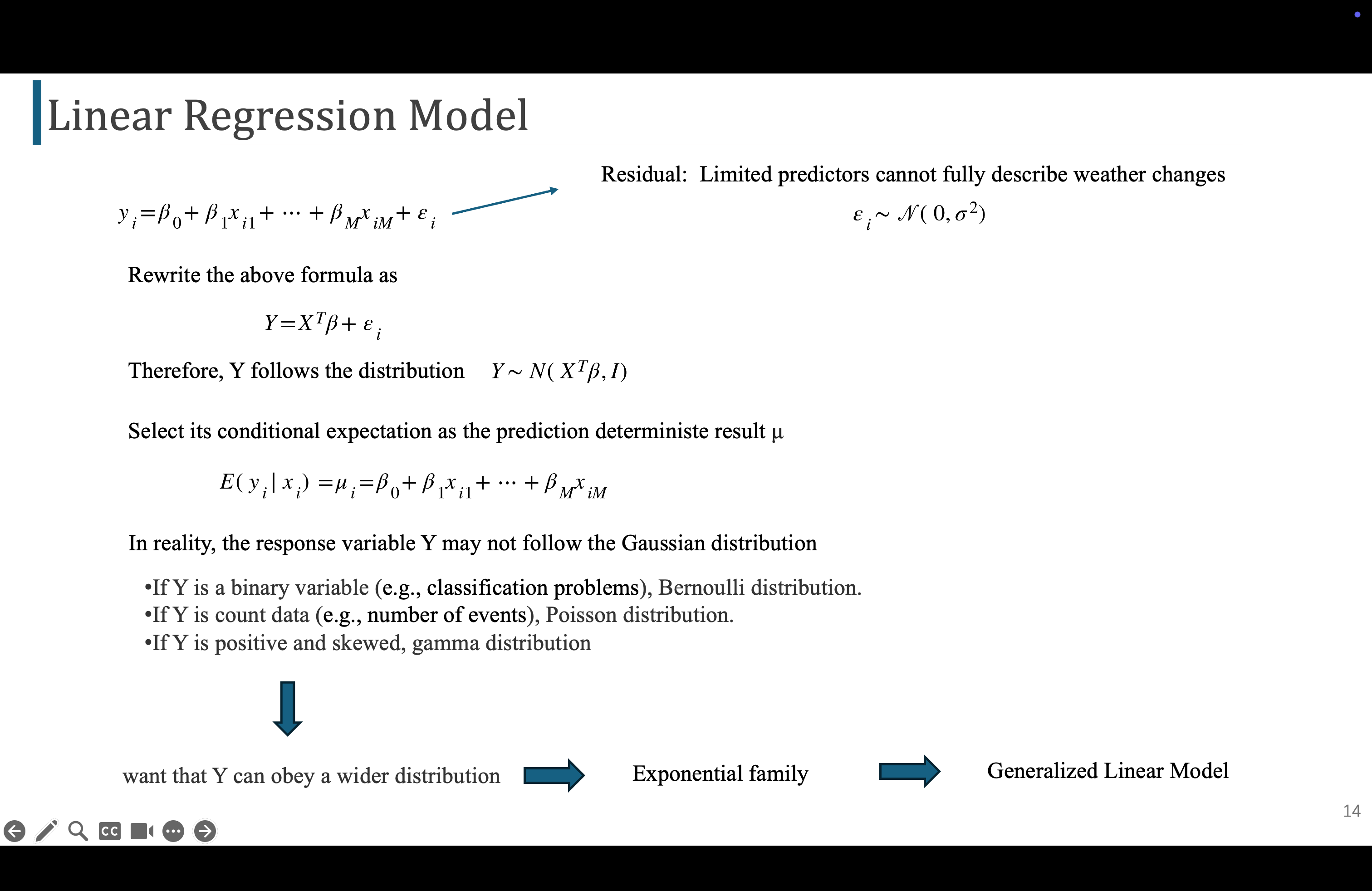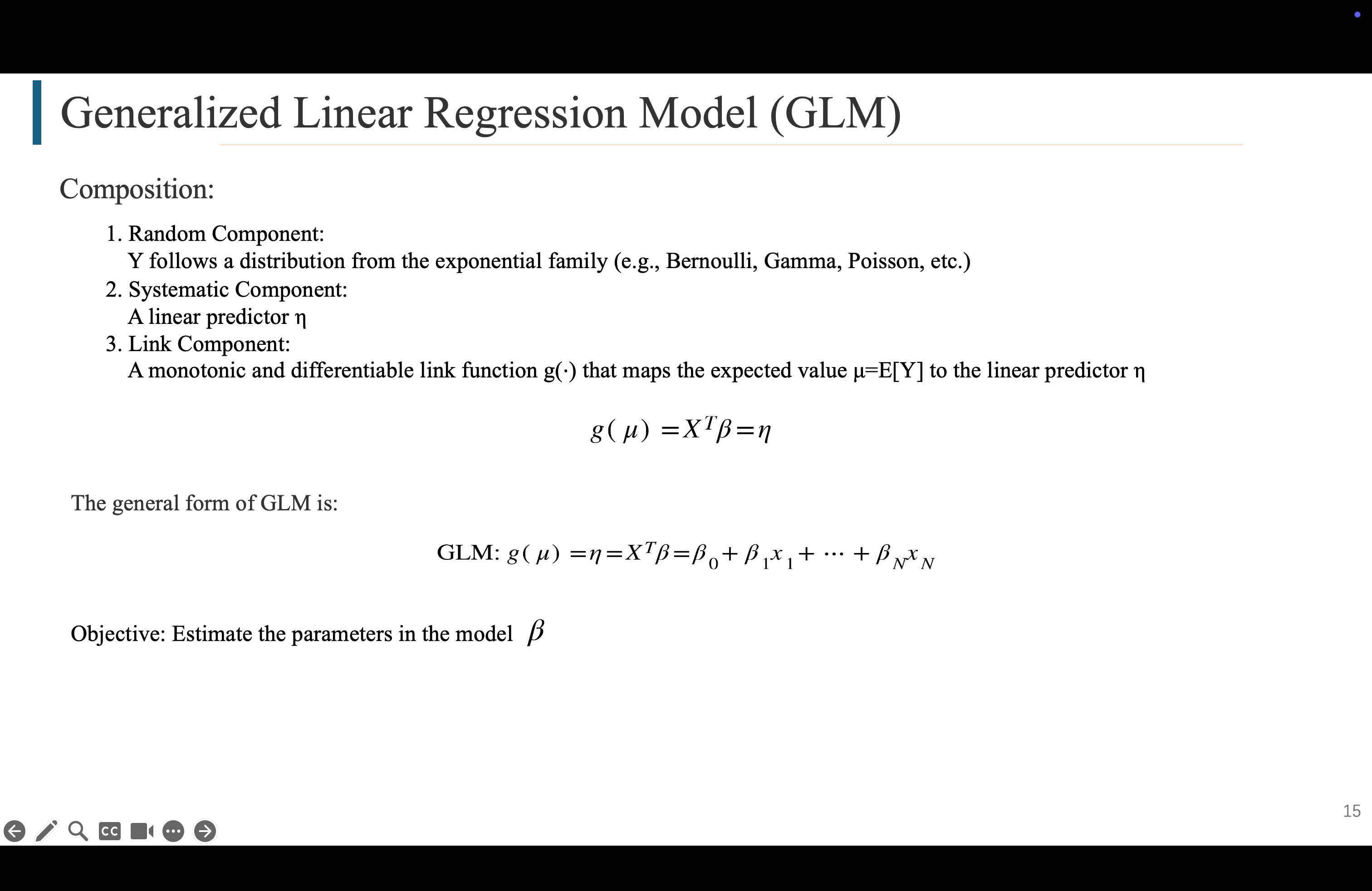 C'est l'expression de base du modèle de régression linéaire, que nous avons étendu pour permettre à Y de suivre différentes distributions, c'est pourquoi nous avons le modèle linéaire généralisé (GLM), ce qui signifie que Y peut suivre n'importe quelle distribution dans la famille des distributions exponentielles.