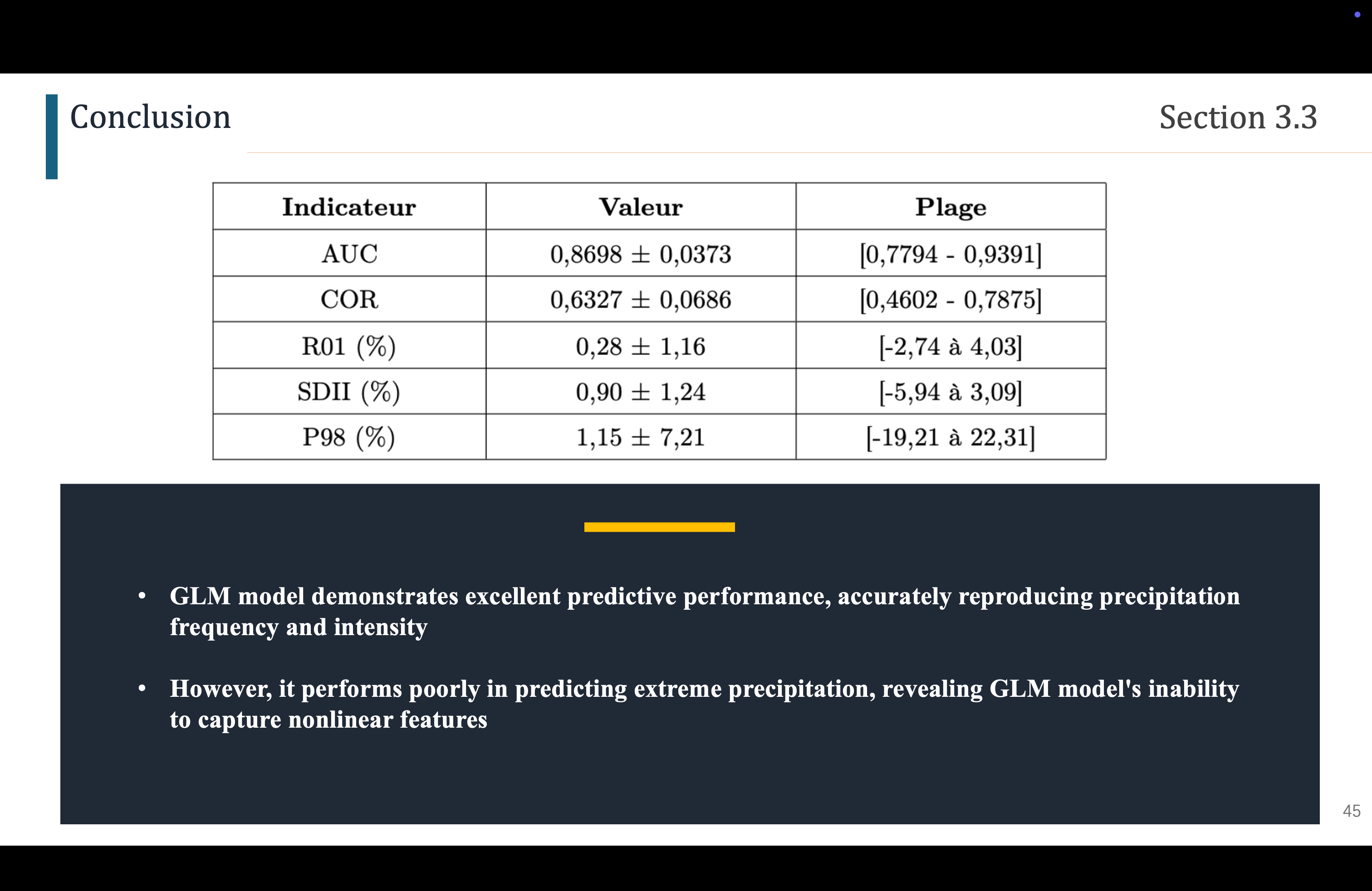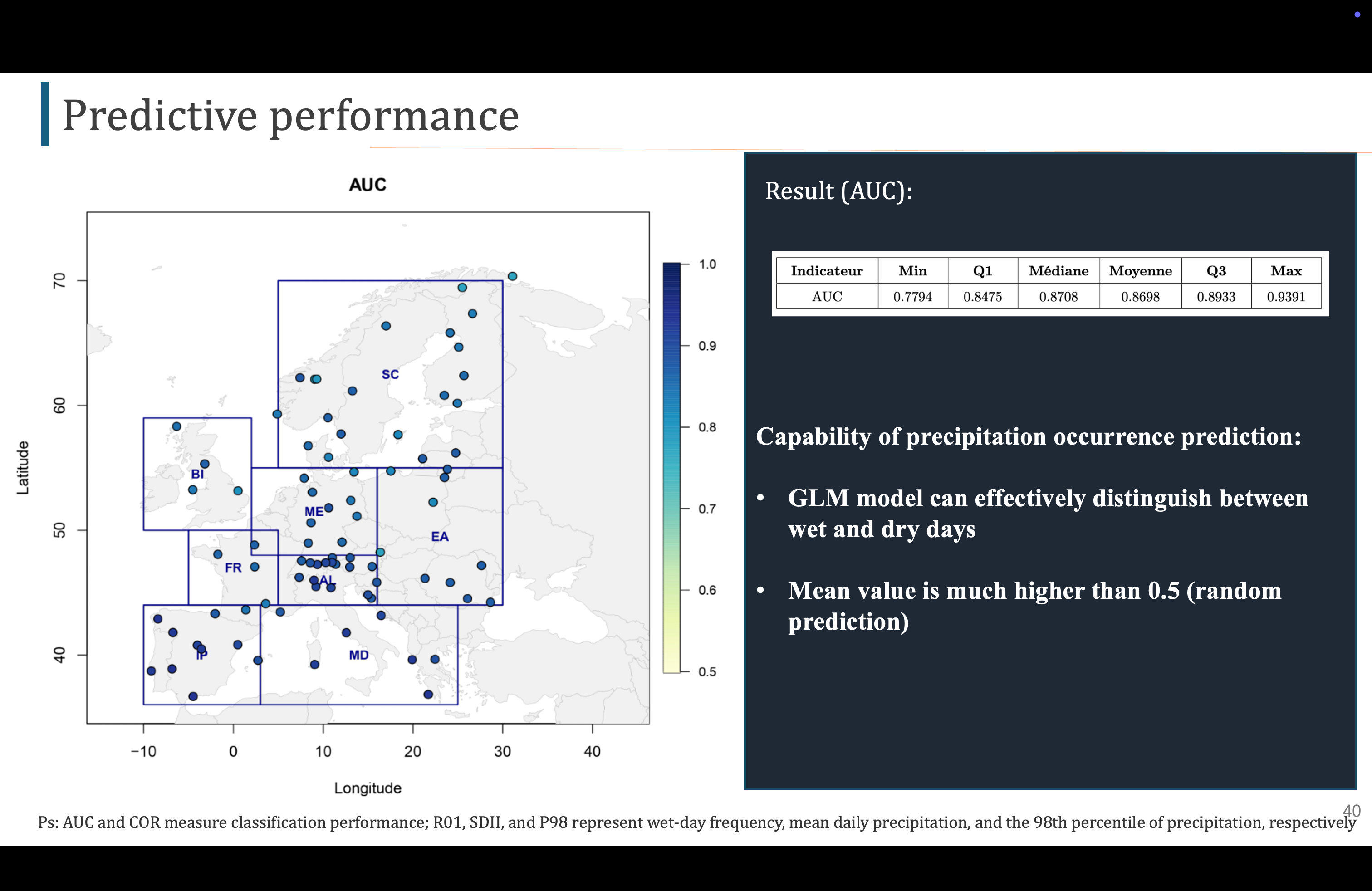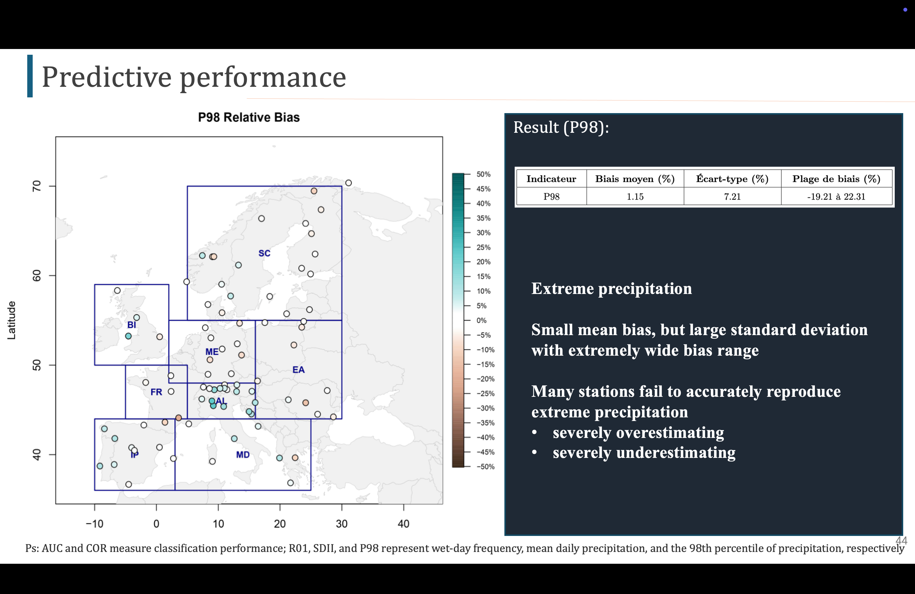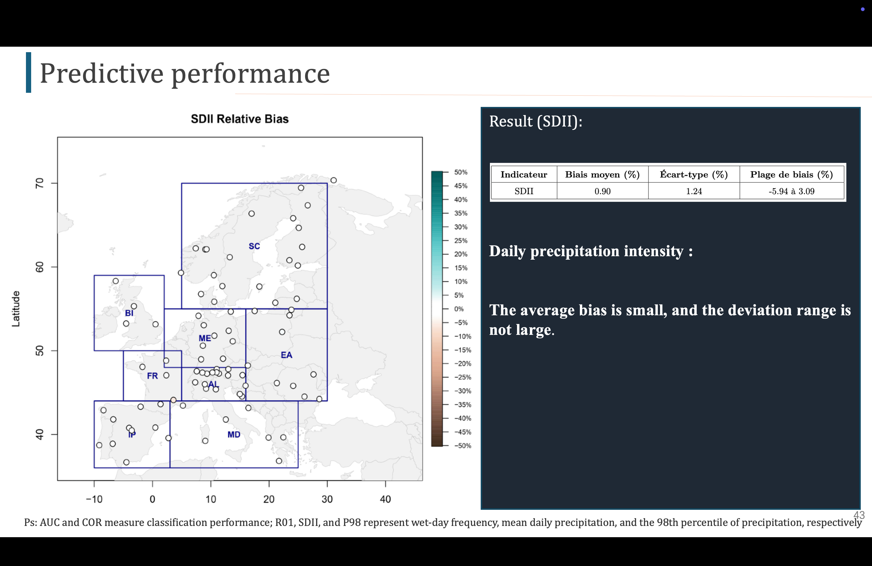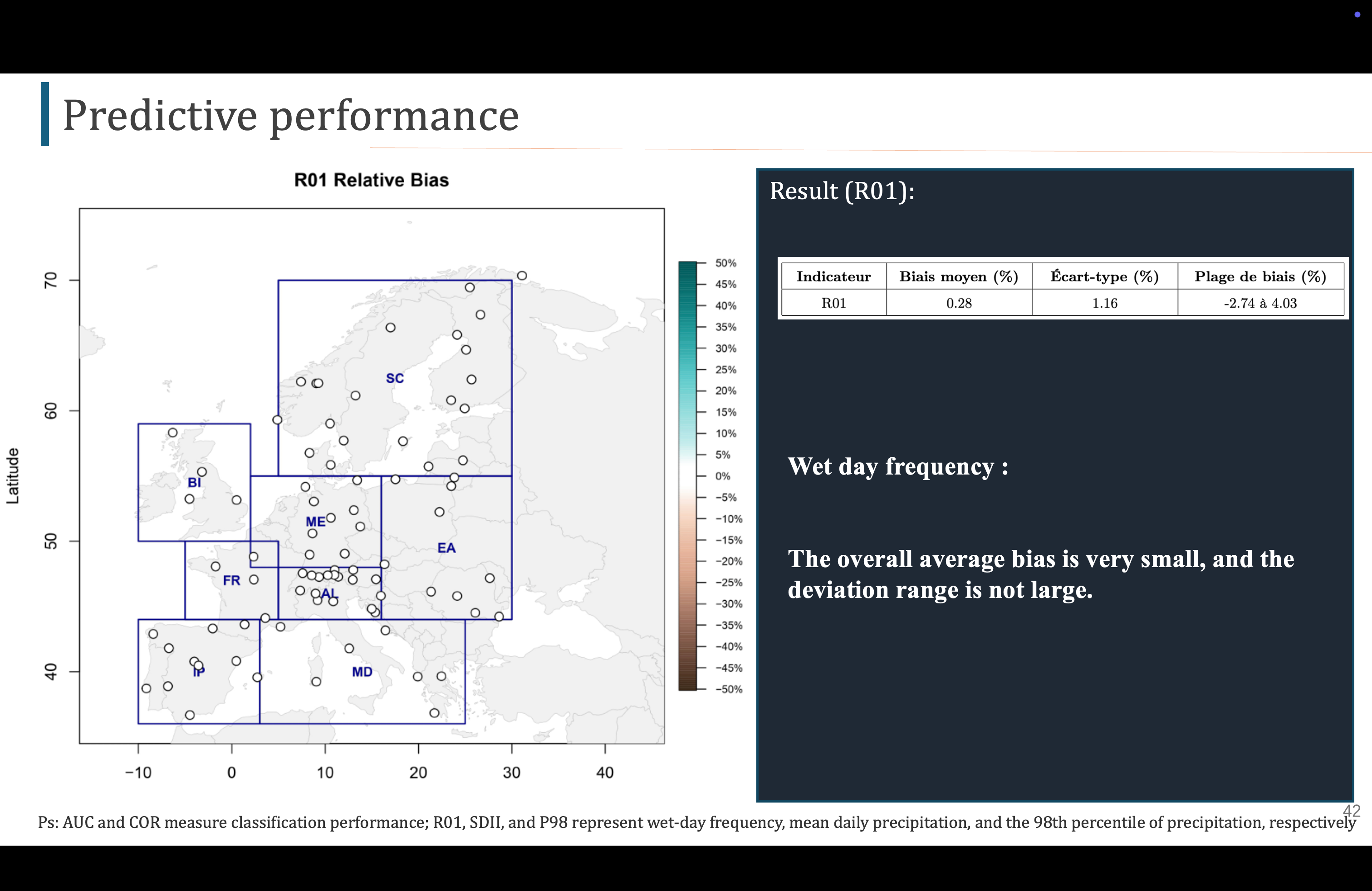 Ceci sont les indicateurs de jugement que nous utiliserons par la suite. L'AUC mesure la capacité du modèle à distinguer les jours secs des jours humides, le COR mesure la corrélation entre la séquence de prévision et la séquence d'observation, le R01 mesure la fréquence des précipitations, le SDII mesure l'intensité des précipitations, le P98 mesure les précipitations extrêmes. Pour ces trois indicateurs, nous utiliserons par la suite la forme de l'écart relatif, c'est-à-dire comparer les valeurs prévues aux valeurs réelles pour voir quel est l'écart.