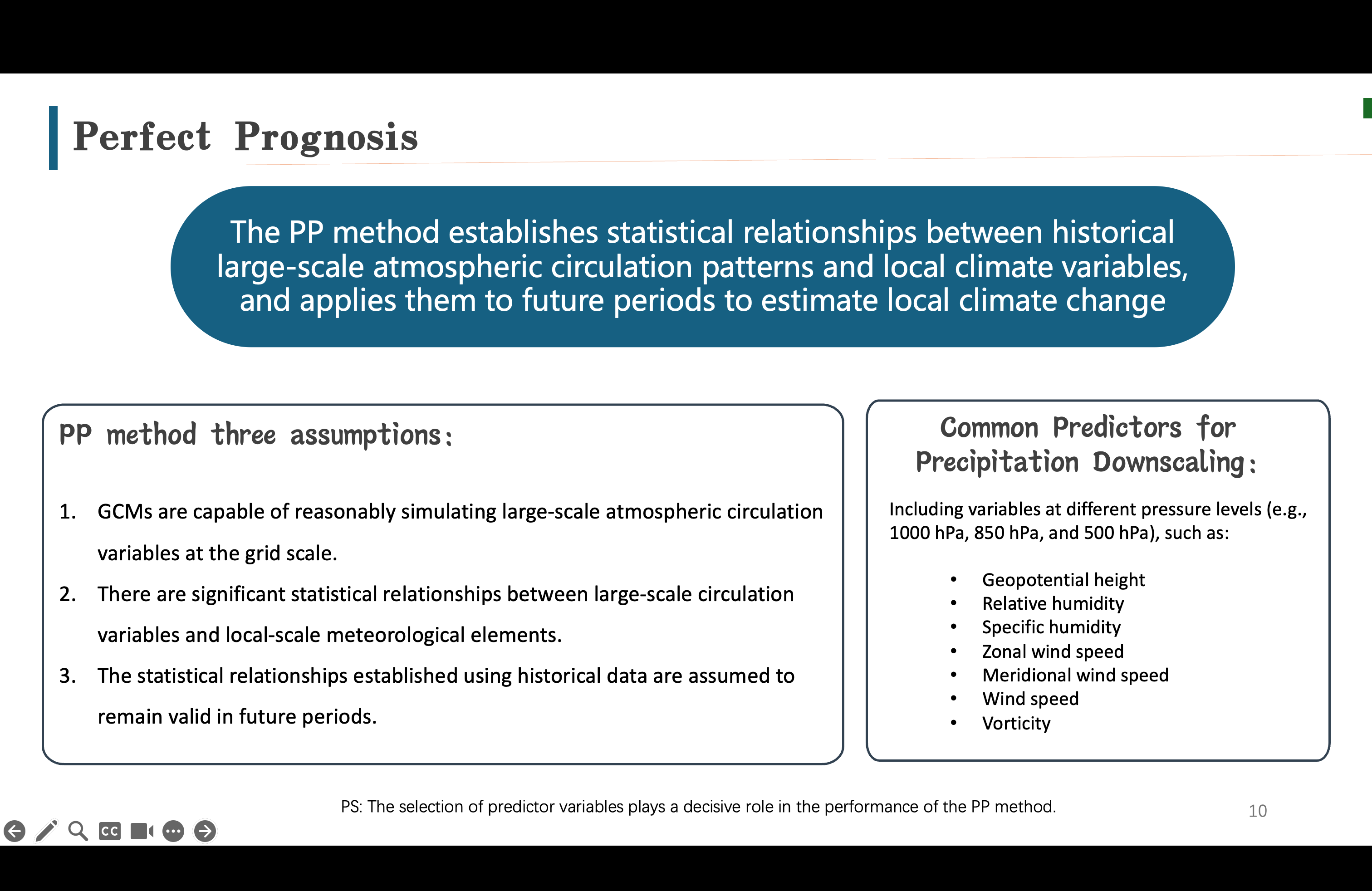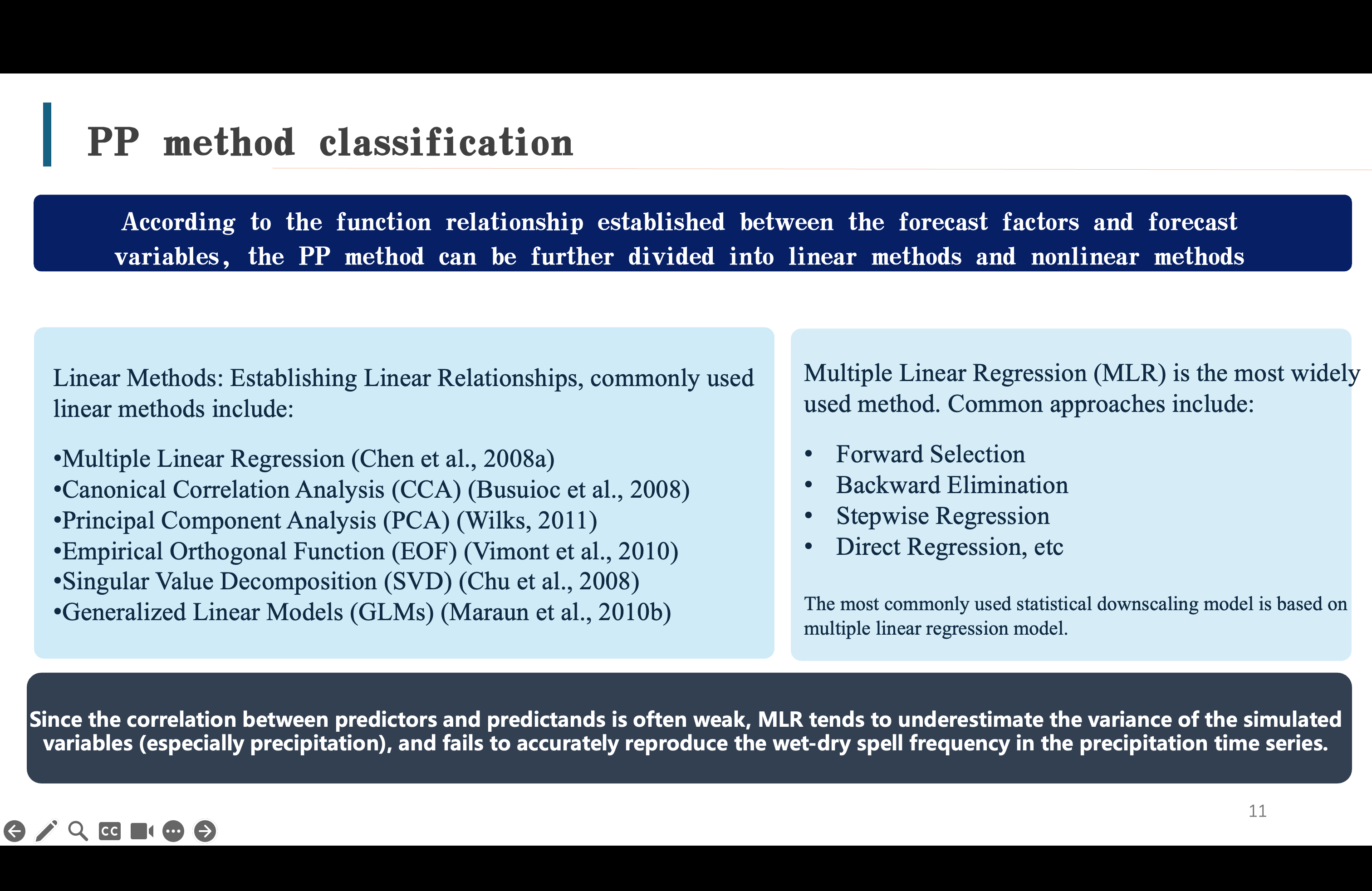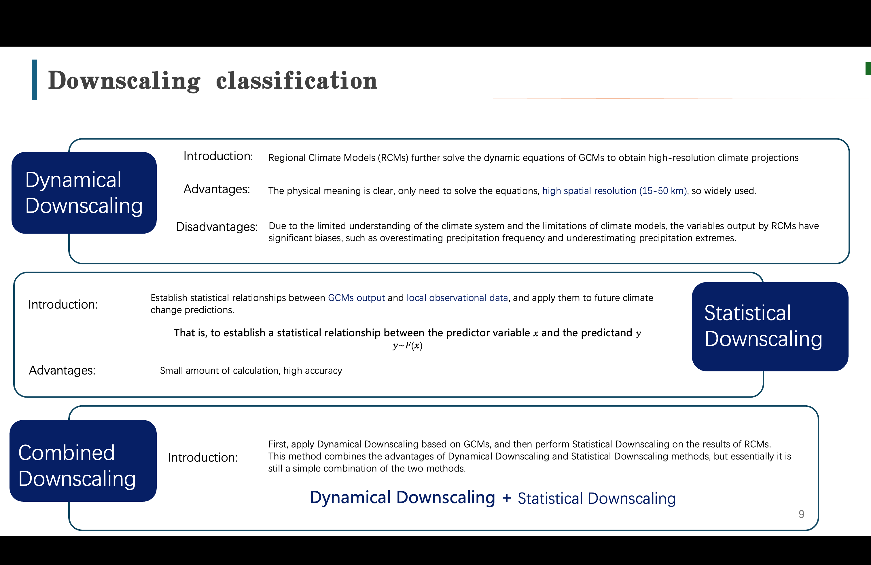 所以我们重点关注,统计降尺度 就是寻找 GCMs 的输出 和 真实观测值之间的统计关系,用历史数据训练好一个模型,然后预测未来气候。优点是,不仅精度高,计算量小