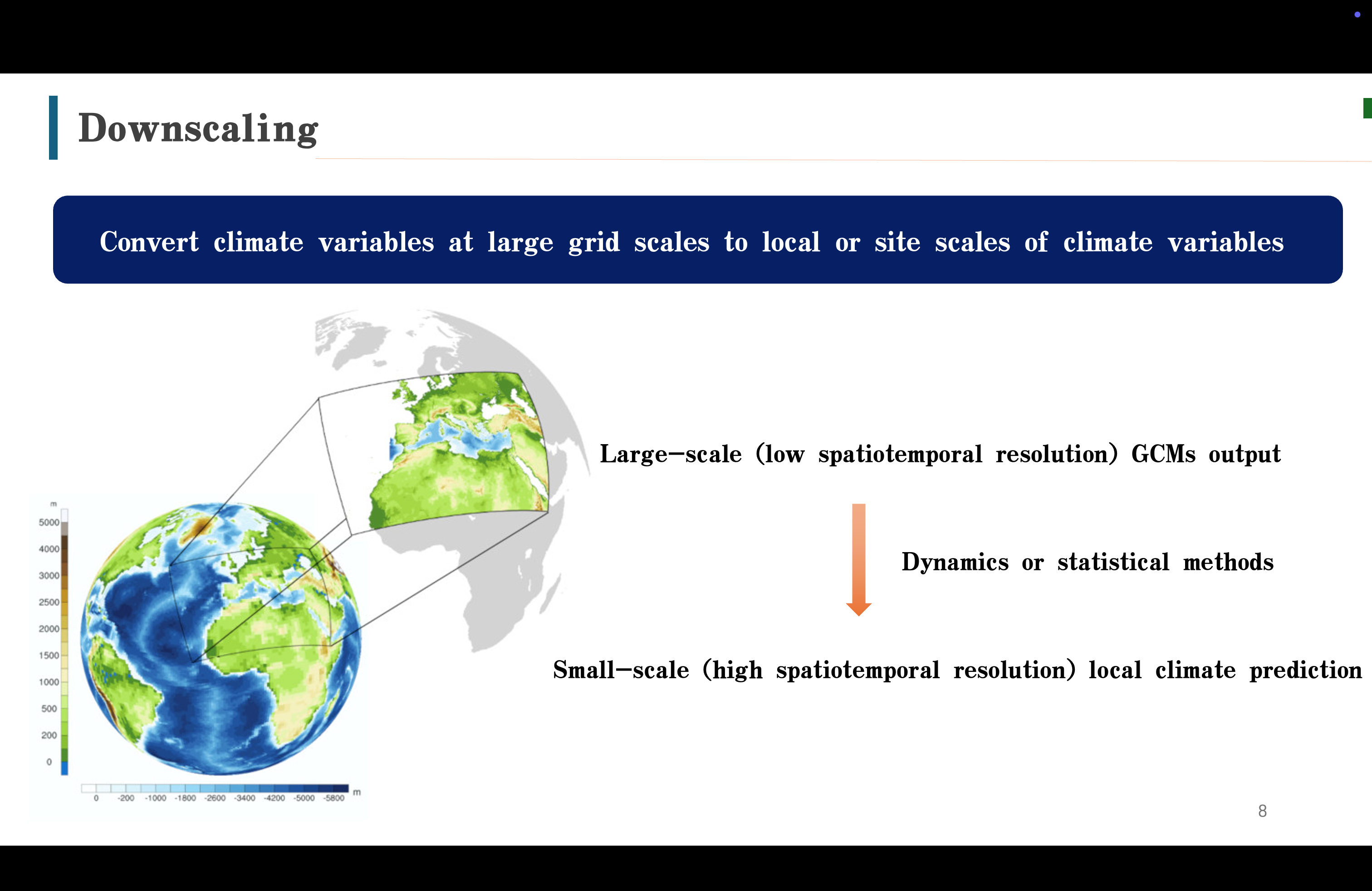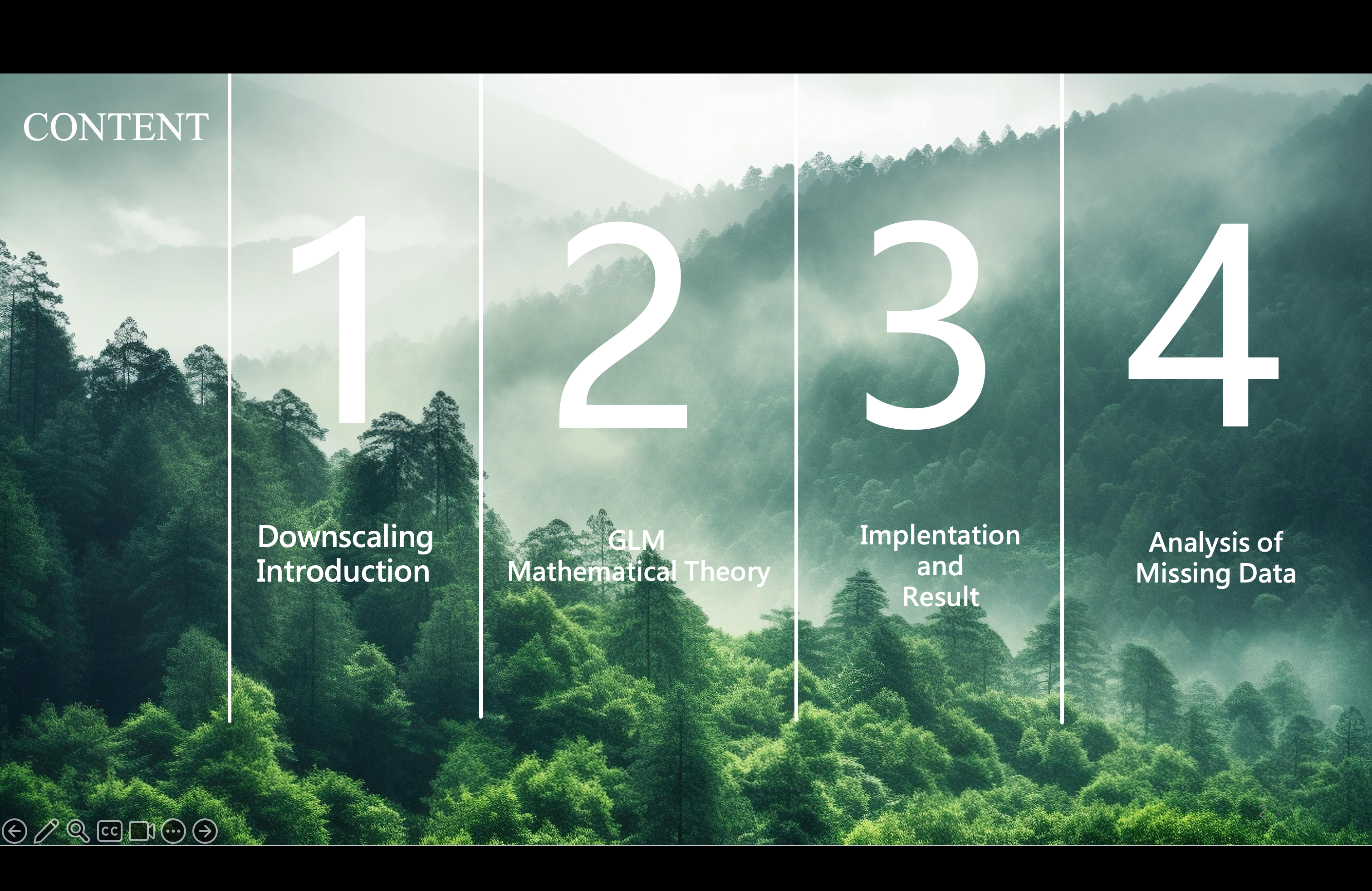 我今天主要介绍四方面,第一部分是降尺度介绍,第二部分是数学理论,第三部分是结果,第四部分重点于在降尺度的背景下缺失数据的模拟