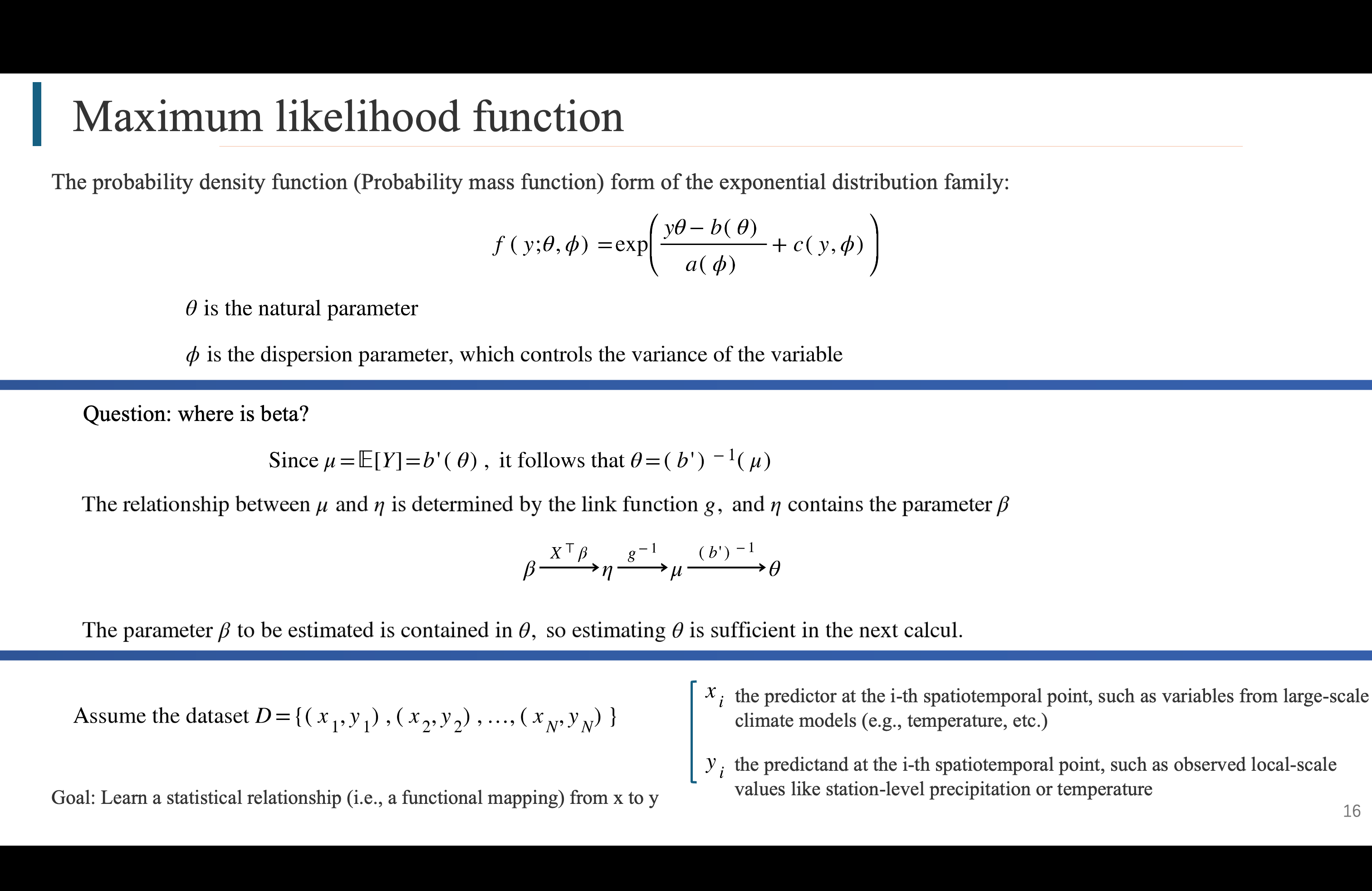 il y a trois parties, la partie la plus importante est link fonction, qui relie l'expérience au prédicteur linéaire.. Dans notre régionalisation des précipitations GLM, notre x est le facteur atmosphérique, le prédicteur, et notre y sont les données observées. L'établissement de la relation statistique consiste à trouver ce beta. Alors, la question est, comment devrions-nous estimer ce beta ? Cela doit certainement être fait par la méthode de maximum de vraisemblance.