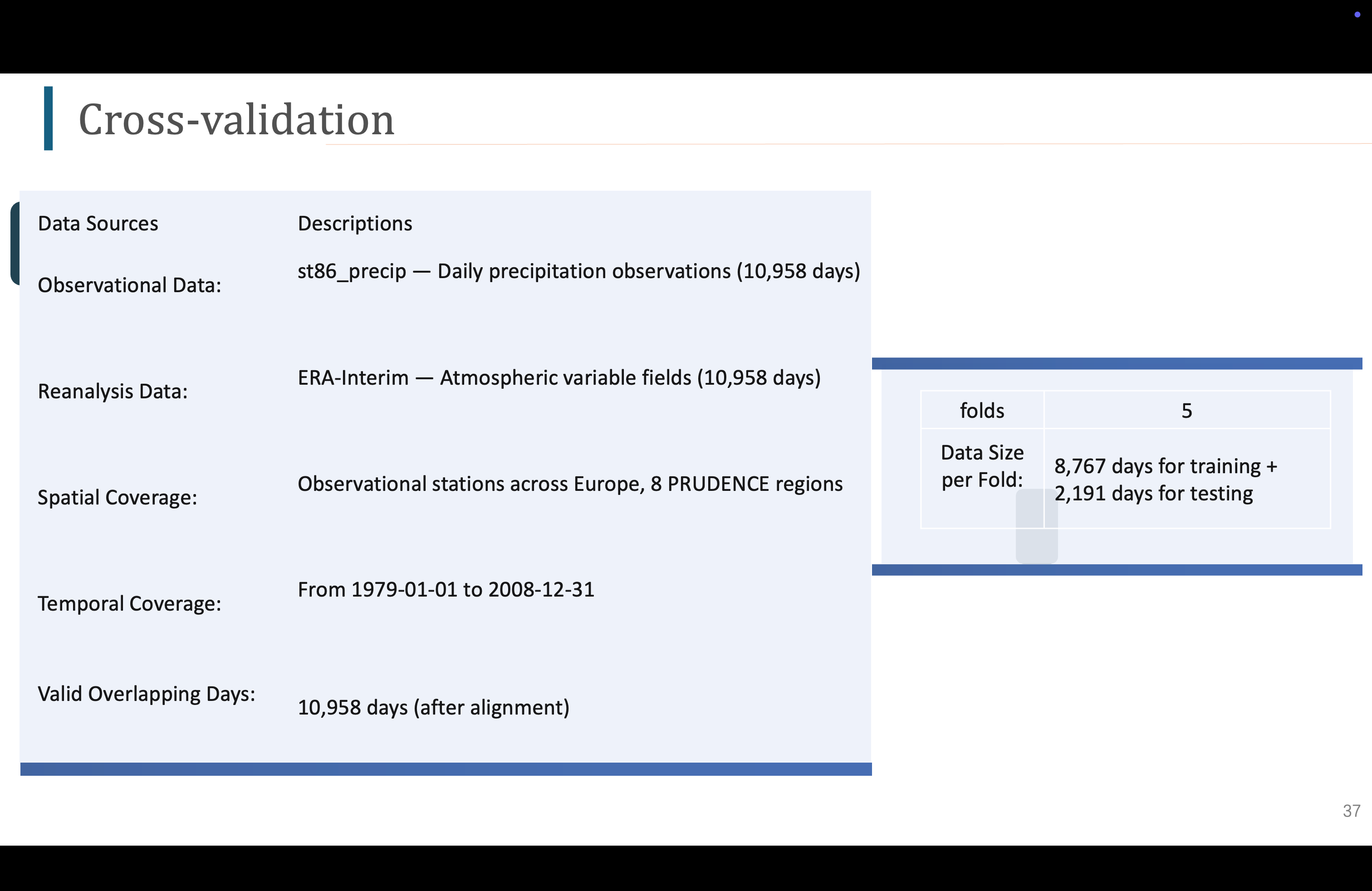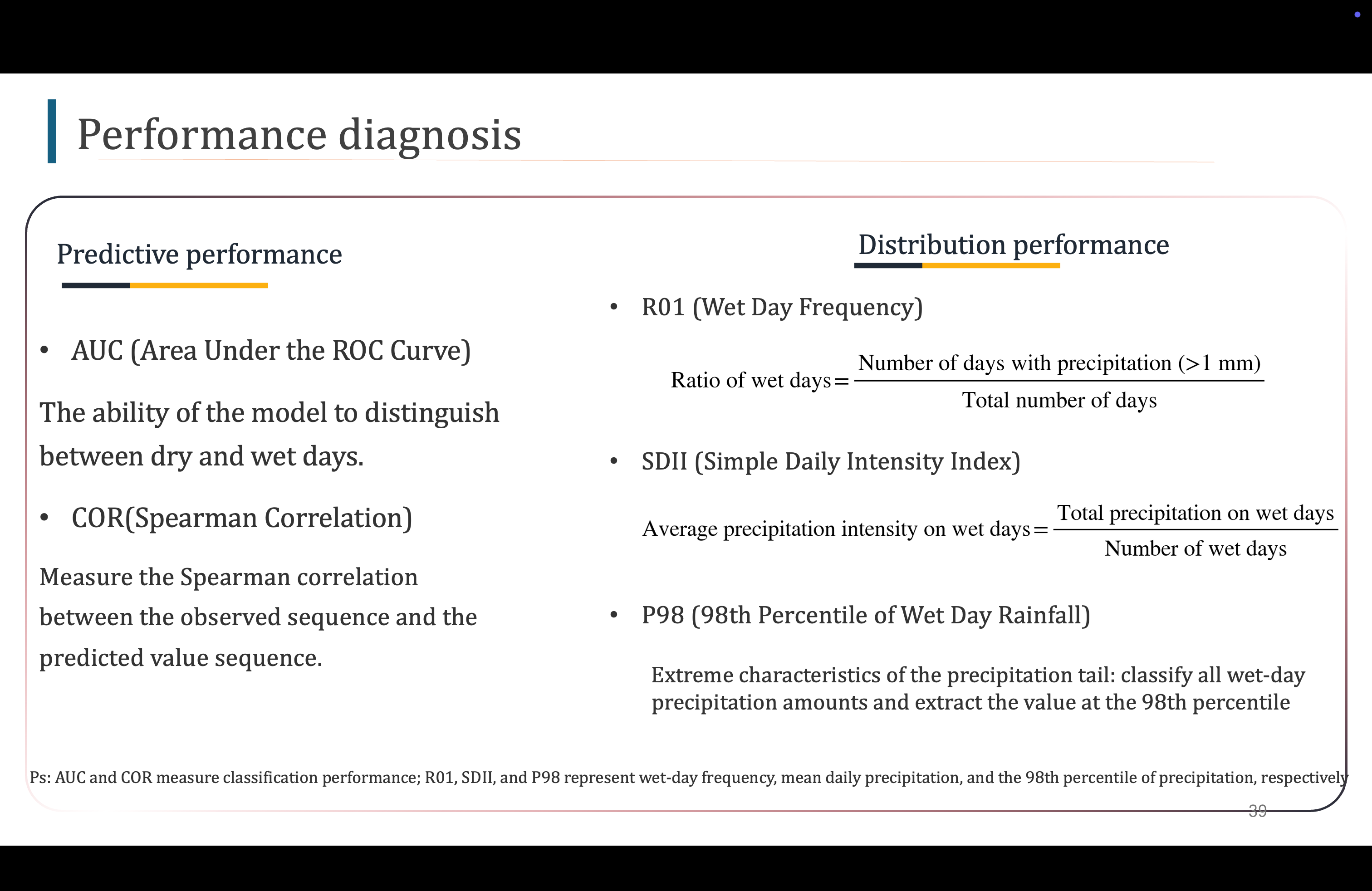 这是我们后续使用的评判指标,AUC衡量模型区分干日和湿日的能力,COR衡量预测序列和观测序列之间的相关性,R01衡量降水频率,SDII衡量降水强度,P98衡量极端降水,这三个指标,我们后续会采用相对偏差的形式,也就是预测值和实际值做对比,查看一下偏差多少