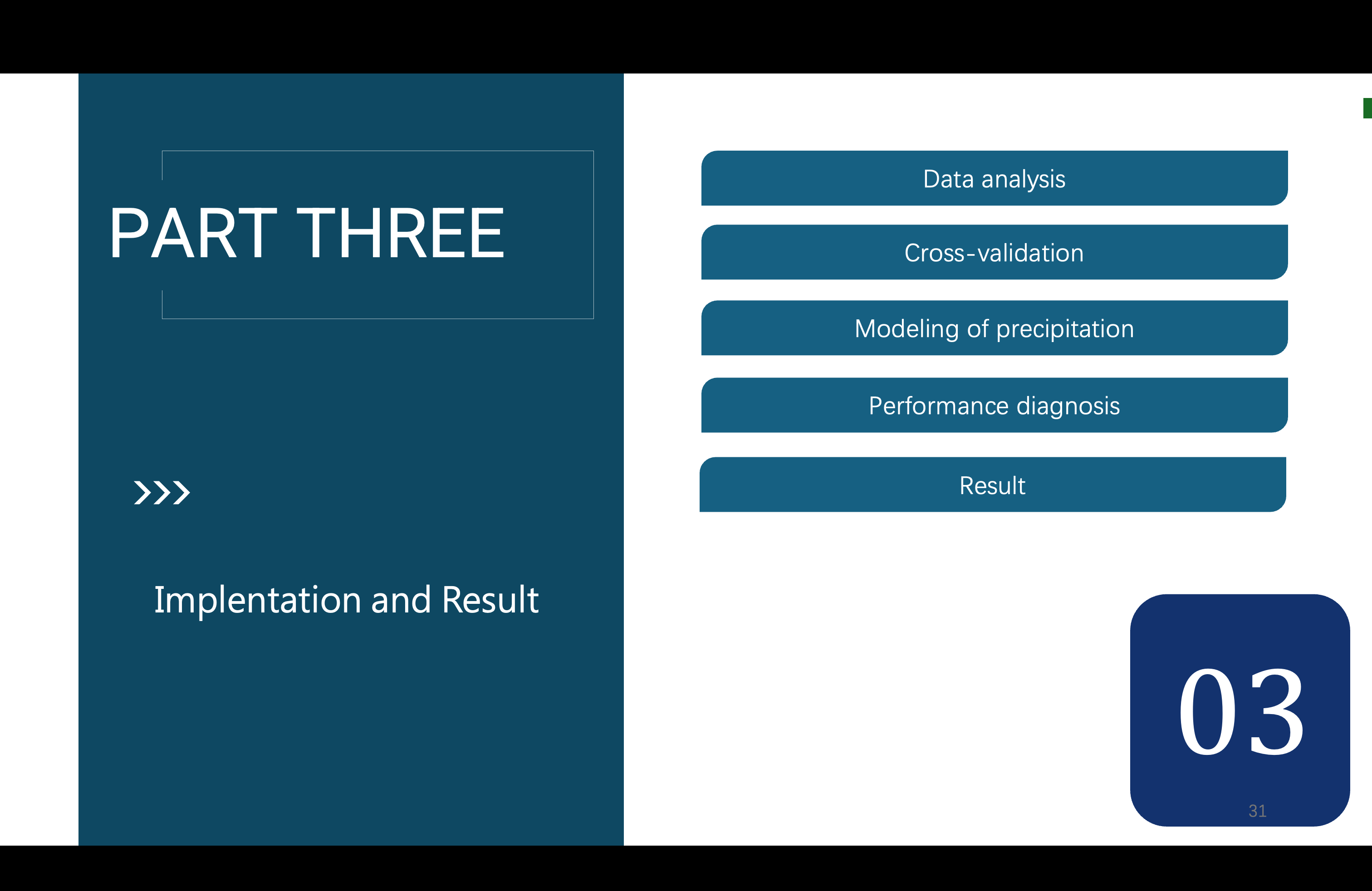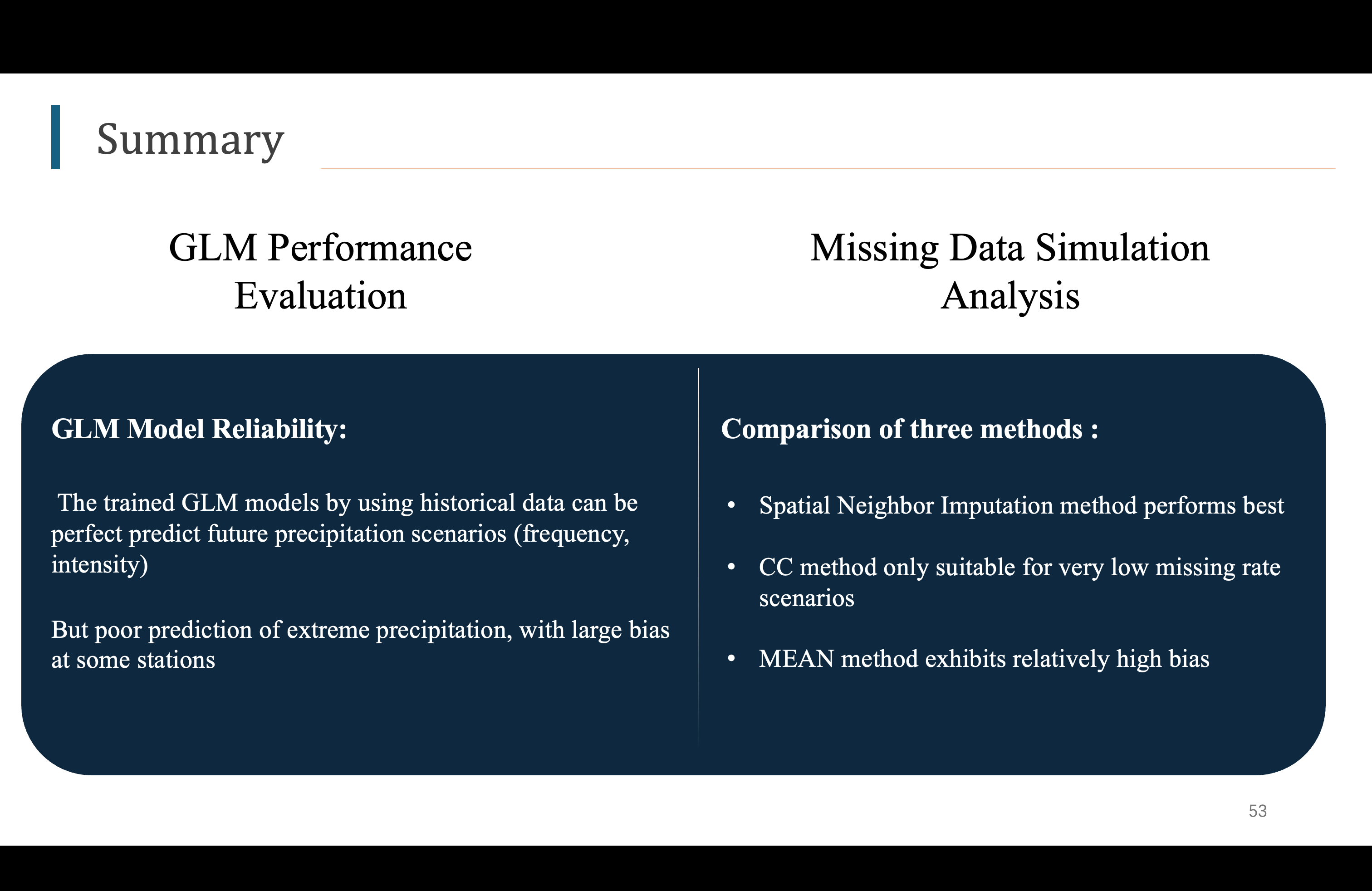 这就是我实习期间做的所有工作,一方面先评估了GLM模型在降水区域化中的应用,另一方面模拟缺失数据的情况,查看当降水区域化中存在缺失数据的时候,三种不同的处理方法的比较,以及对GLM模型预测性能的影响。