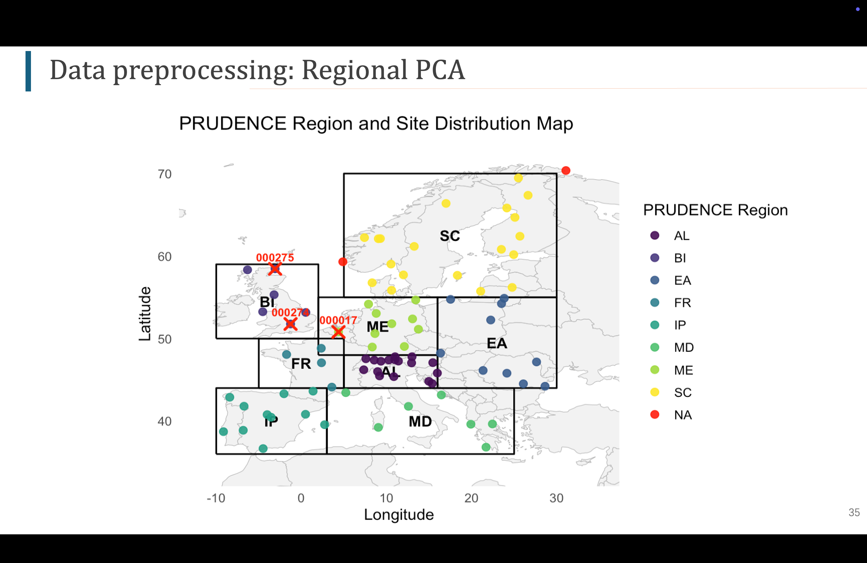 Étant donné que nous avons vu que les dimensions des prédicteurs x étaient très grandes, nous devons effectuer une opération de réduction de dimension en utilisant l'ACP pour extraire les composantes principales (pcs) qui expliquent 95% de la variance. Nous effectuons l'ACP en fonction de la région de prédiction. En d'autres termes, nous devons entraîner un modèle GLM pour chaque site, en utilisant les composantes principales de chaque région comme entrée du modèle GLM. L'avantage est que nous prenons en compte les facteurs géographiques. Par exemple, pour les sites en France, j'utilise uniquement les composantes principales des prédicteurs de la France pour l'entraînement, au lieu d'utiliser les informations atmosphériques de l'Allemagne. Ainsi, les composantes principales extraites peuvent mieux expliquer les variations atmosphériques de cette région.