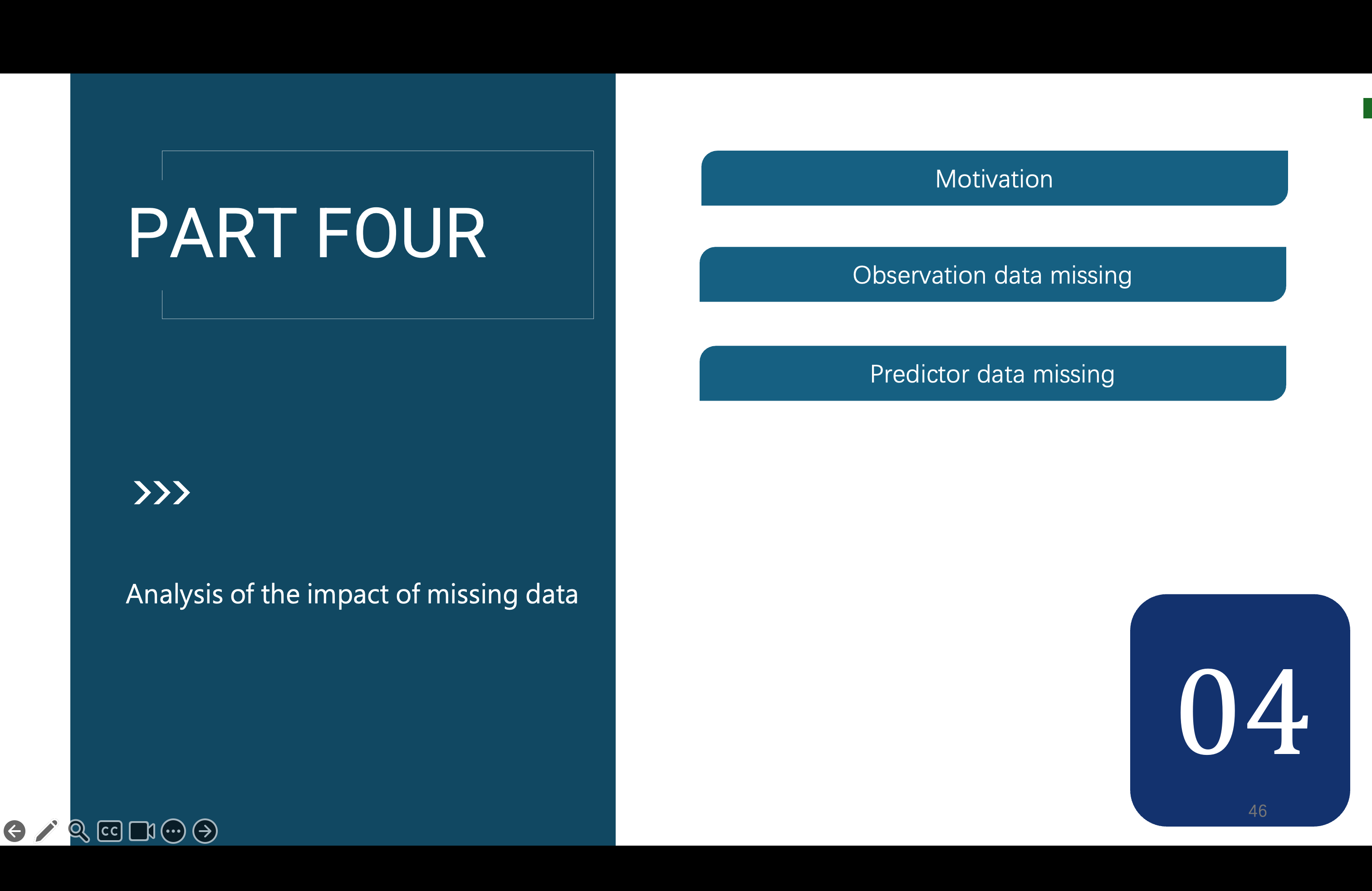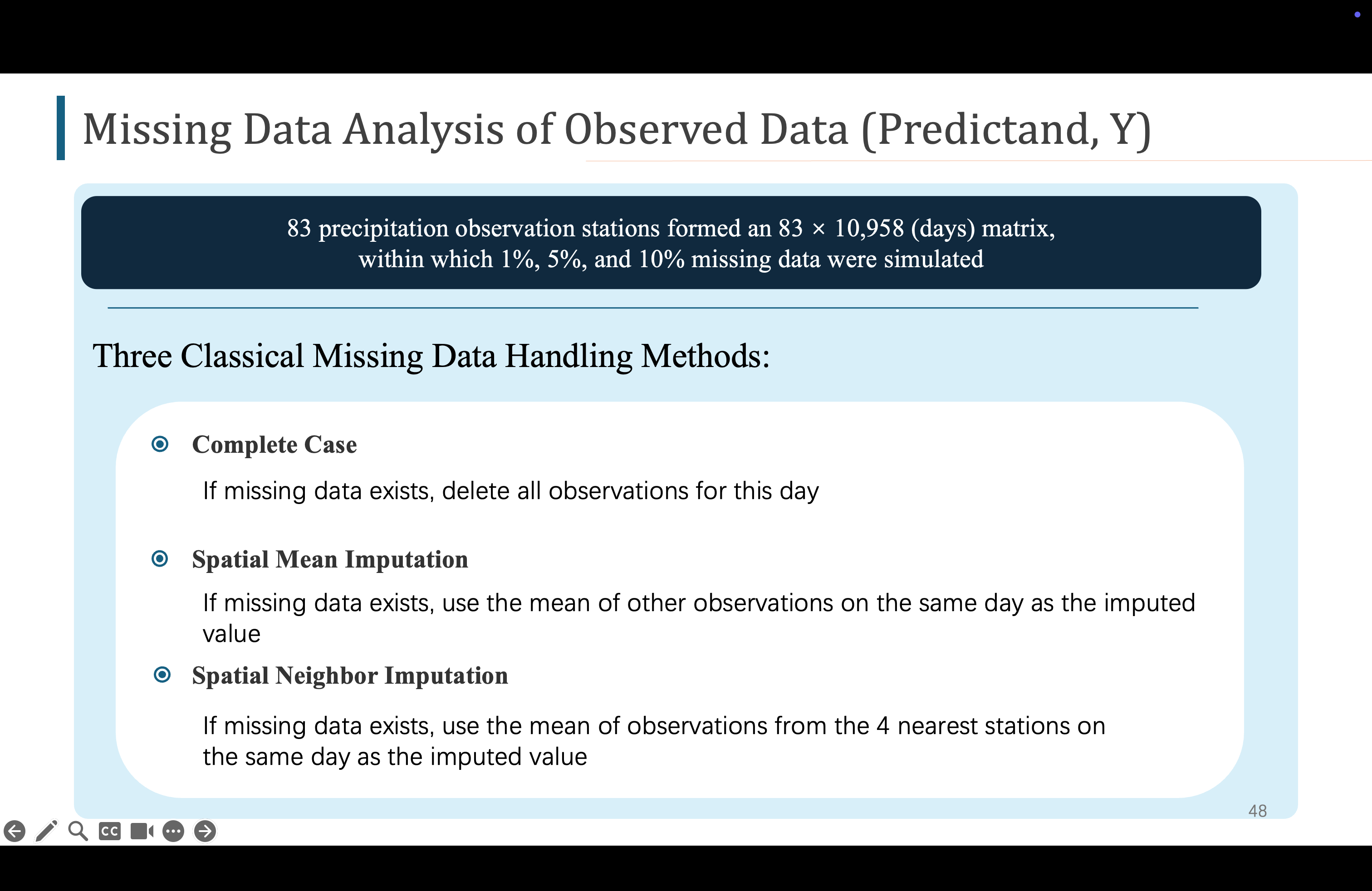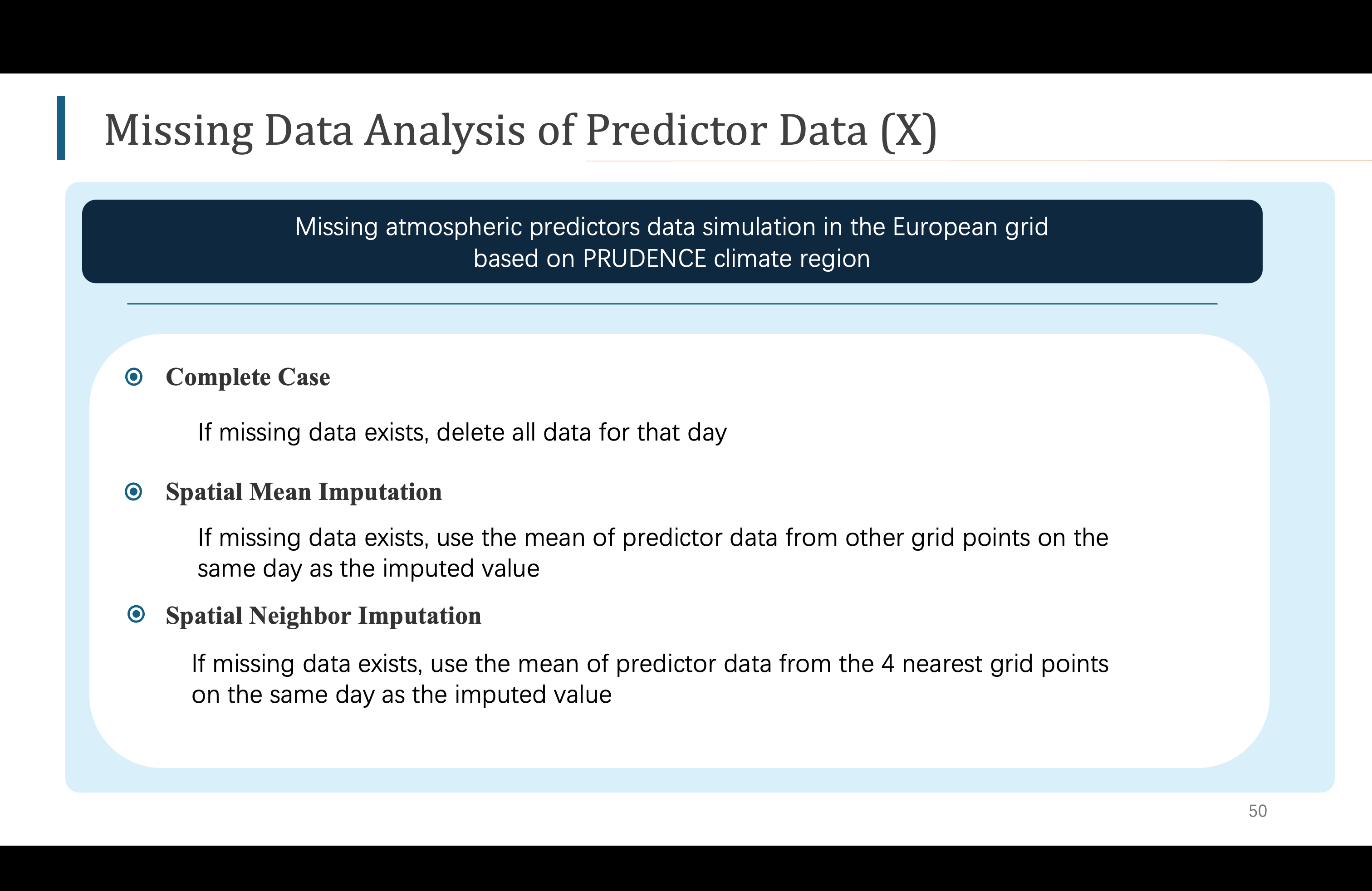 第四部分是模拟缺失数据,因为很多区域化的研究都假设数据是完整无缺的,但是实际并非如此,包括我们之前的86的站点中,有三个站点带有缺失数据,因此我们删除了这三个站点,不再用于训练,所以我们模拟了这种缺失数据的情况,有两个cas,第一个是观测数据缺失,比如站点传感器实效,第二个是预测因子缺失,比如说我们缺少了一些大气信息