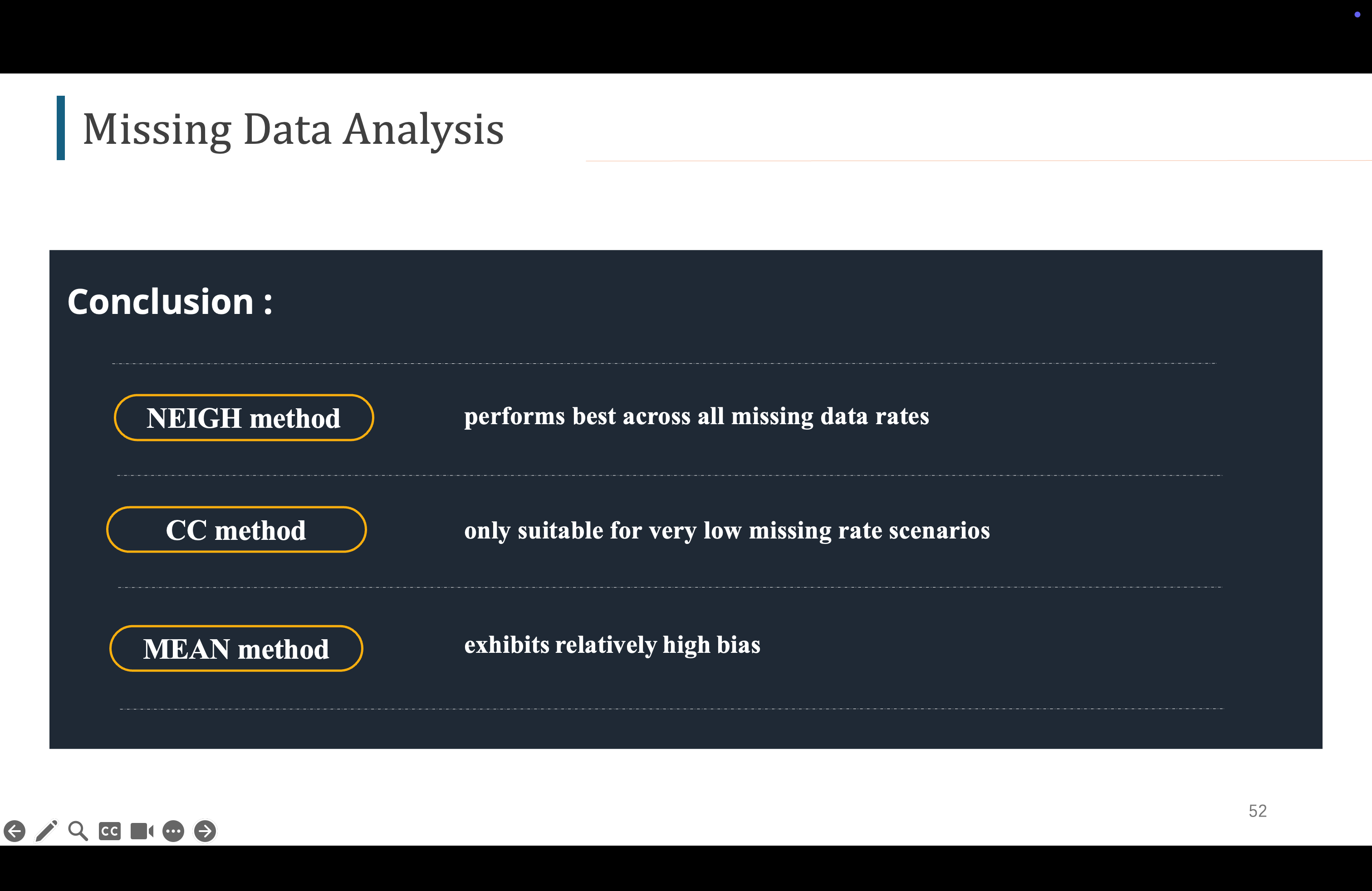 最后我们对于y 的缺失数据模拟结果如下,在1%缺失率下,所有性能指标表现变差,AUC COR降低,偏差变大,方差偏大,但是三种方法中,neigh方法的表现最好,随着缺失率的上升,GLM模型的预测性能越来越差,偏差不断变大,但是一直都是neigh方法最好,当10%缺失率的时候,CC方法会删除几乎所有的数据,我们就没有数据用于训练了,所以这里是空的,对于mean neigh方法,neigh方法最好