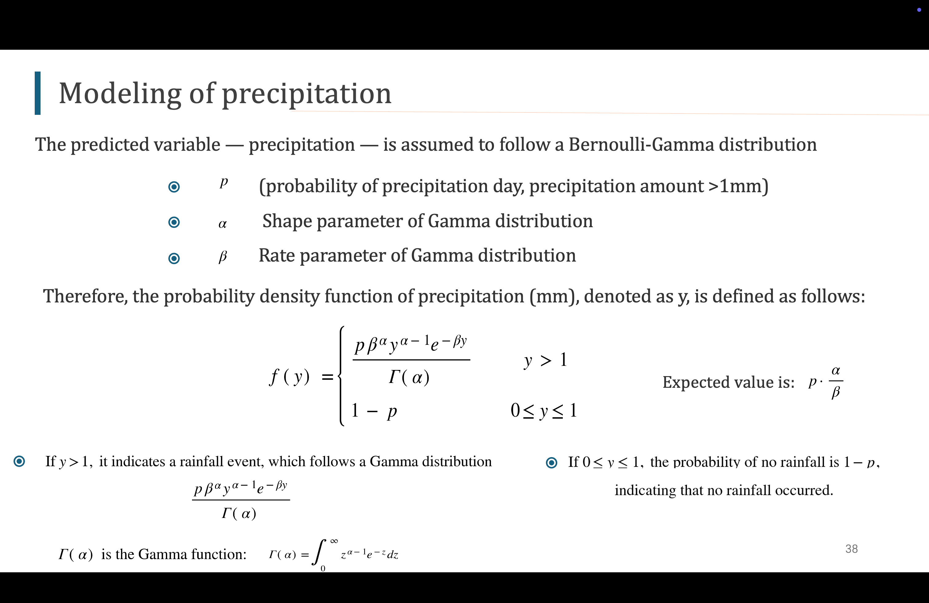 Ceci est la fonction de densité de probabilité du modèle de précipitations, proposée par des chercheurs précédents, divisée en deux parties. Cette partie est une distribution de Bernoulli, utilisée pour décrire si la pluie se produit ou non. Si la quantité de pluie est inférieure à 1 mm, il fait sec. Si la quantité de pluie est supérieure à 1 mm, il est considéré comme un jour de pluie, ce qui correspond à une distribution gamma. Notre objectif final est d'obtenir ces deux distributions. Ainsi, la probabilité p est la clé de la distribution de Bernoulli, et les paramètres de forme et de taux sont les plus importants pour la distribution gamma.