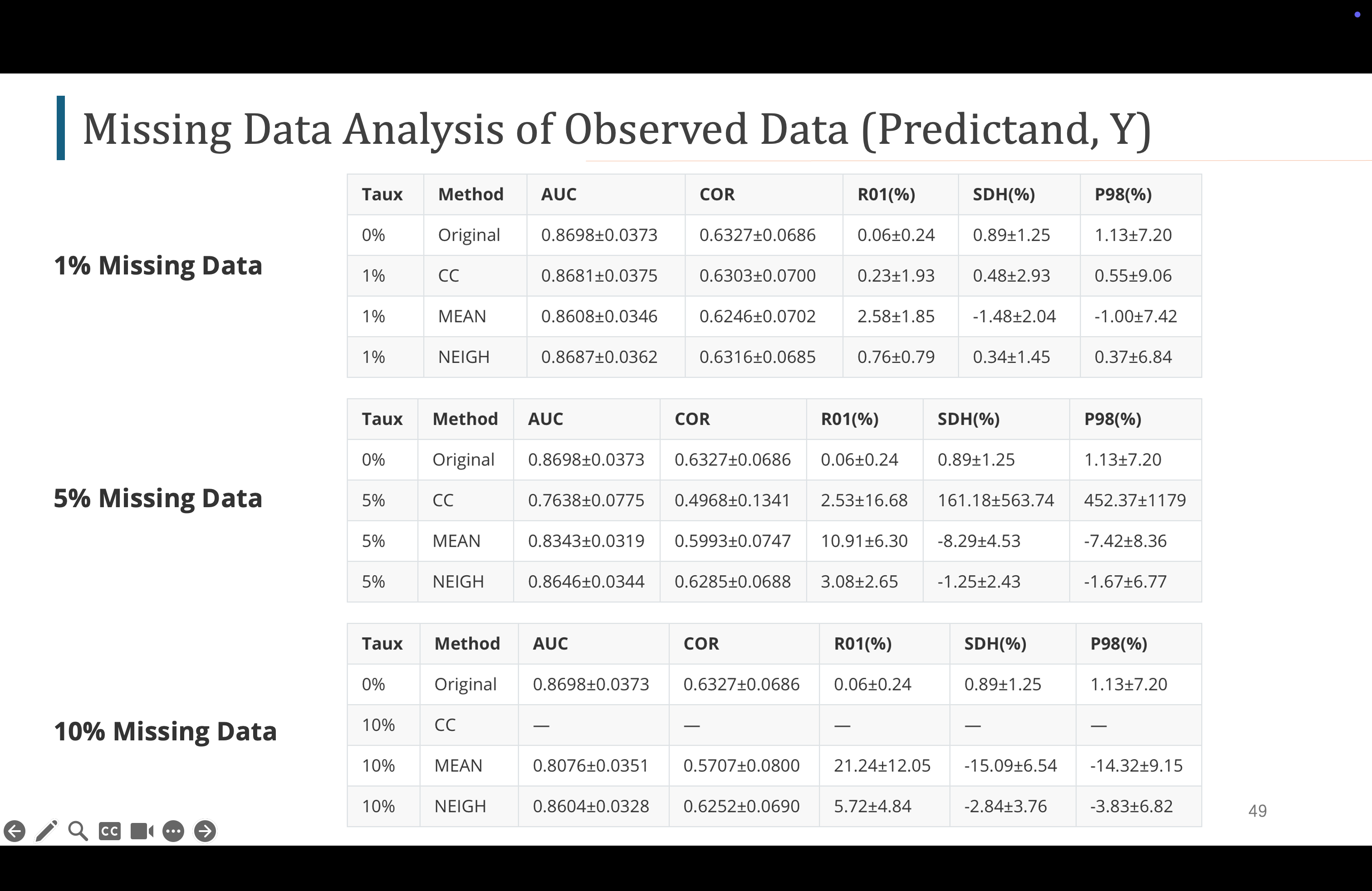 Voici les résultats de la simulation des données manquantes pour y. Avec un taux de manque de 1 %, toutes les mesures de performance se détériorent, l'AUC COR diminue, le biais augmente, la variance est élevée, mais parmi les trois méthodes, la méthode neigh est la meilleure. Avec l'augmentation du taux de manque, les performances prédictives du modèle GLM deviennent de plus en plus mauvaises, le biais augmente continuellement, mais la méthode neigh reste la meilleure. Lorsque le taux de manque est de 10 %, la méthode CC supprime presque toutes les données, nous n'avons donc plus de données pour l'entraînement, donc cette partie est vide. Pour la méthode mean neigh, la méthode neigh est la meilleure.